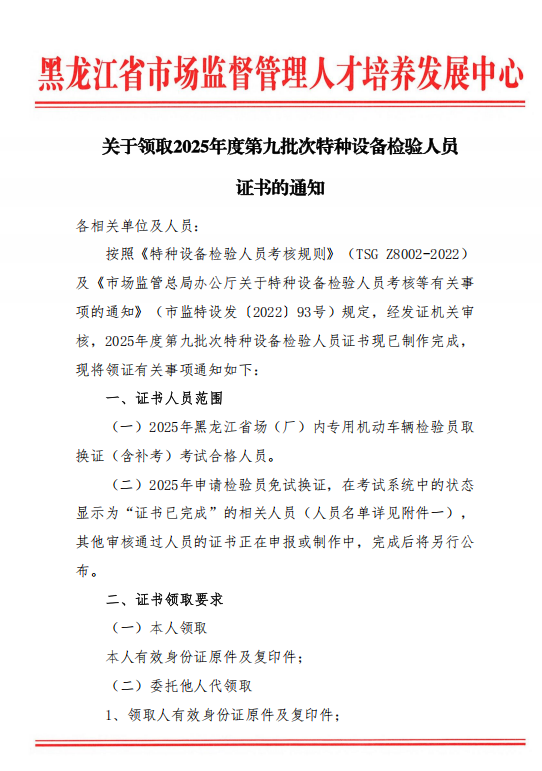 关于领取2025年度第九批次特种设备检验人员证书的通知